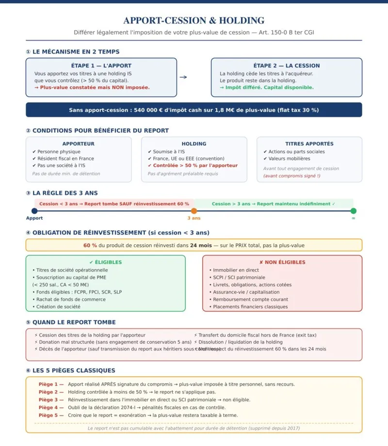 Techniquement, il n'existe pas de délai minimum entre l'apport et la cession des titres par la holding. Ce qui compte, c'est que l'apport soit réalisé avant tout engagement de cession. Si la holding cède dans les 3 ans, elle devra réinvestir 60 % du produit dans les 24 mois. Si elle cède après 3 ans, aucune obligation de réinvestissement.