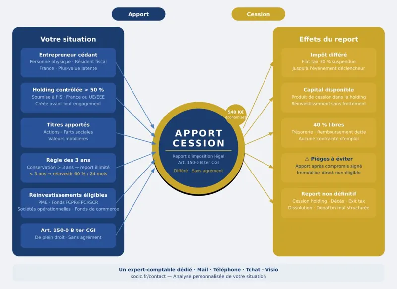 Cet article a été rédigé par l'équipe Socic.fr, expert-comptable en ligne spécialisé dans l'accompagnement des entrepreneurs et dirigeants. L'apport-cession est un mécanisme puissant mais techniquement exigeant — pour analyser votre situation, contactez-nous.