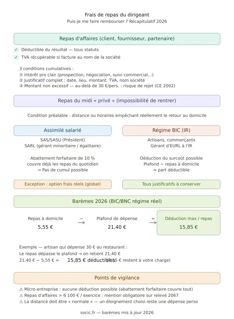 Exception possible : si vous optez pour la déduction des frais réels (et que vous les justifiez), mais c'est un arbitrage global — pas seulement sur les repas. Retrouvez les enjeux de ce choix dans notre article sur les frais de trajet domicile-travail du dirigeant.