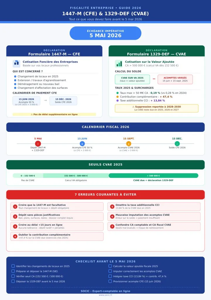 Les entreprises soumises à la CFE qui ont connu en 2025 un changement affectant les éléments servant à déterminer la base (notamment la consistance des locaux utilisés) doivent déposer la 1447-M auprès du SIE au plus tard le 5 mai 2026.