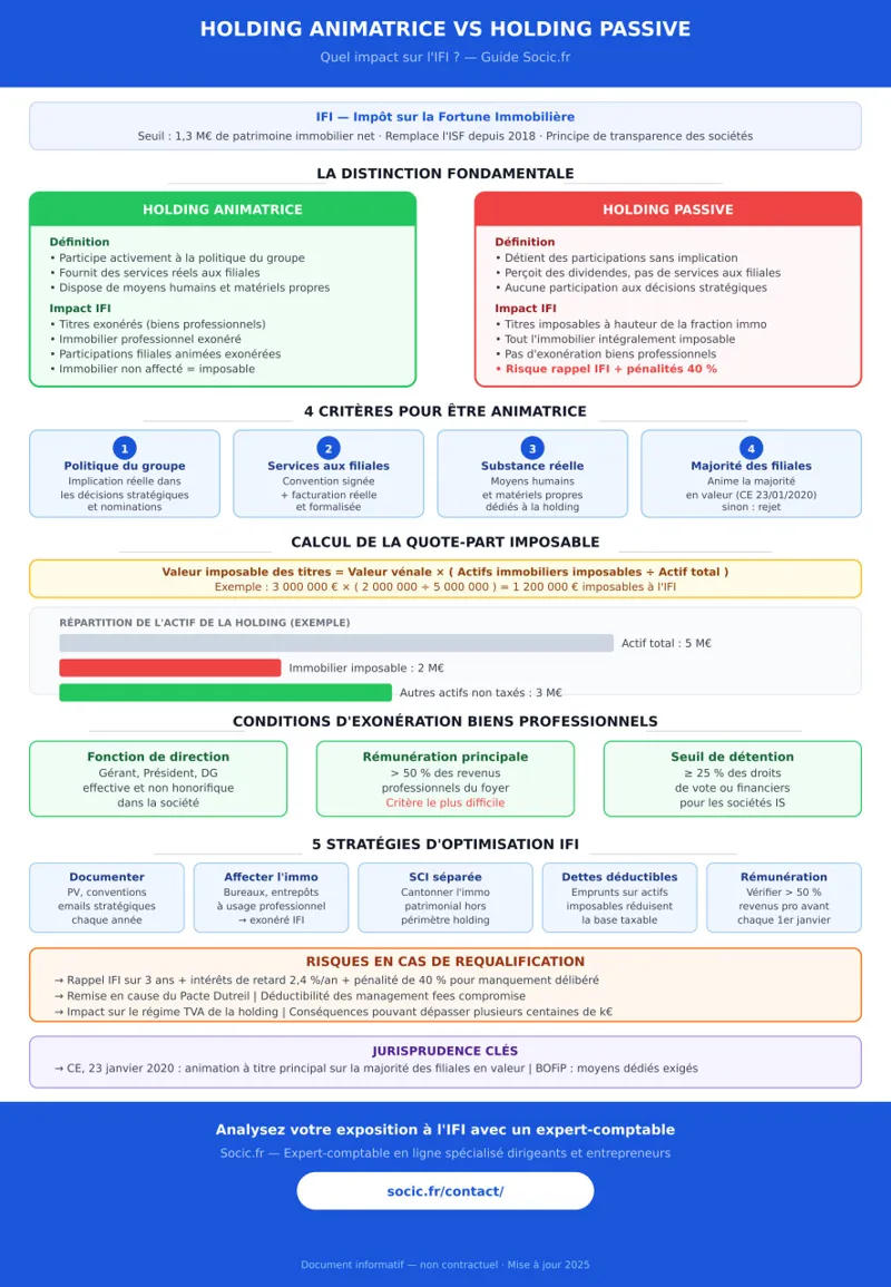 L'Impôt sur la Fortune Immobilière (IFI) est devenu, depuis 2018, le principal impôt patrimonial pesant sur les contribuables fortunés. Et pour les dirigeants qui détiennent leur immobilier via une holding, la question de la qualification de cette holding — animatrice ou passive — est absolument déterminante.