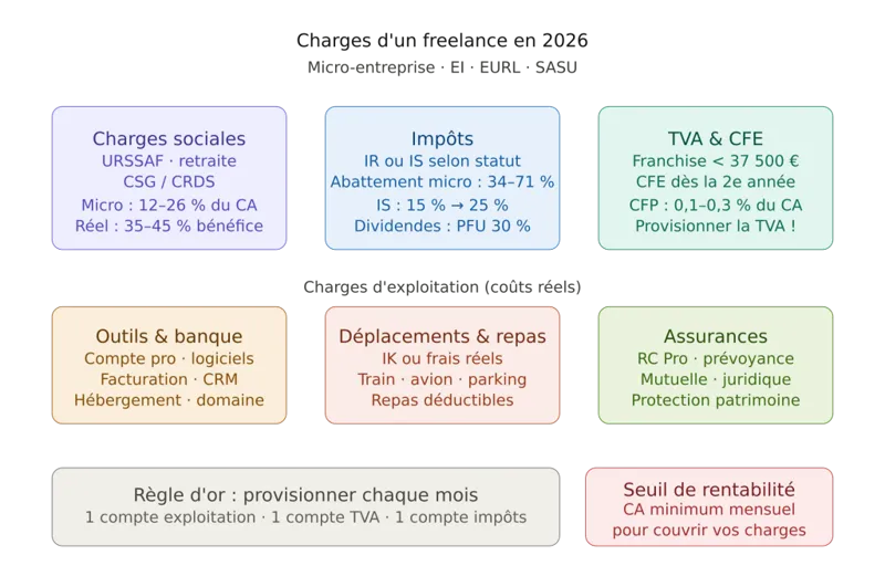 Les principales charges sont (1) les cotisations sociales (URSSAF, retraite, CSG/CRDS), (2) les impôts (IR ou IS), (3) la TVA si vous y êtes assujetti, (4) la CFE, (5) la CFP, et (6) les charges d’exploitation (assurances, outils, banque, matériel, coworking, sous-traitance).