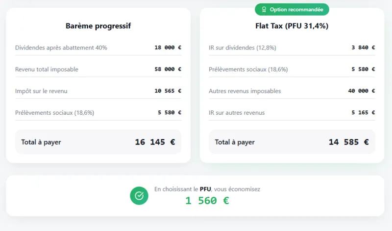 🧮 Vous hésitez entre PFU et barème ? Nos experts-comptables réalisent la simulation pour vous et vous indiquent l'option la plus avantageuse selon votre profil.