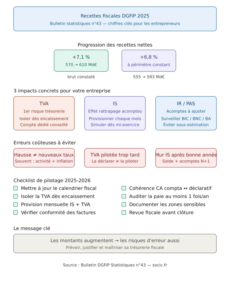 Le Bulletin DGFiP envoie un message clair : en 2025, la collecte fiscale accélère fortement, avec une hausse des recettes nettes de +7,1 % (et +6,8 % à périmètre constant). Pour les entrepreneurs, l’enjeu n’est pas de commenter la macroéconomie, mais de transformer cette information en discipline de gestion.